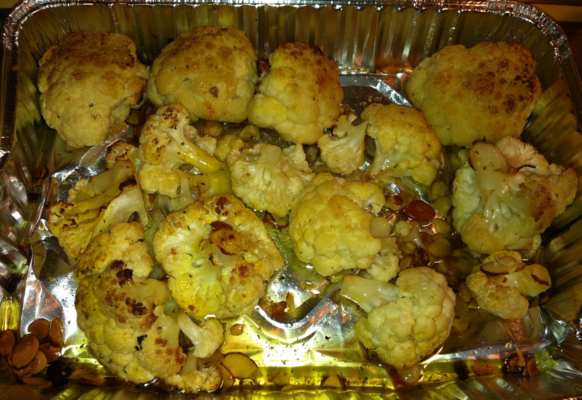 4. Pour coconut oil over the cauliflower and sprinkle sliced almonds throughout