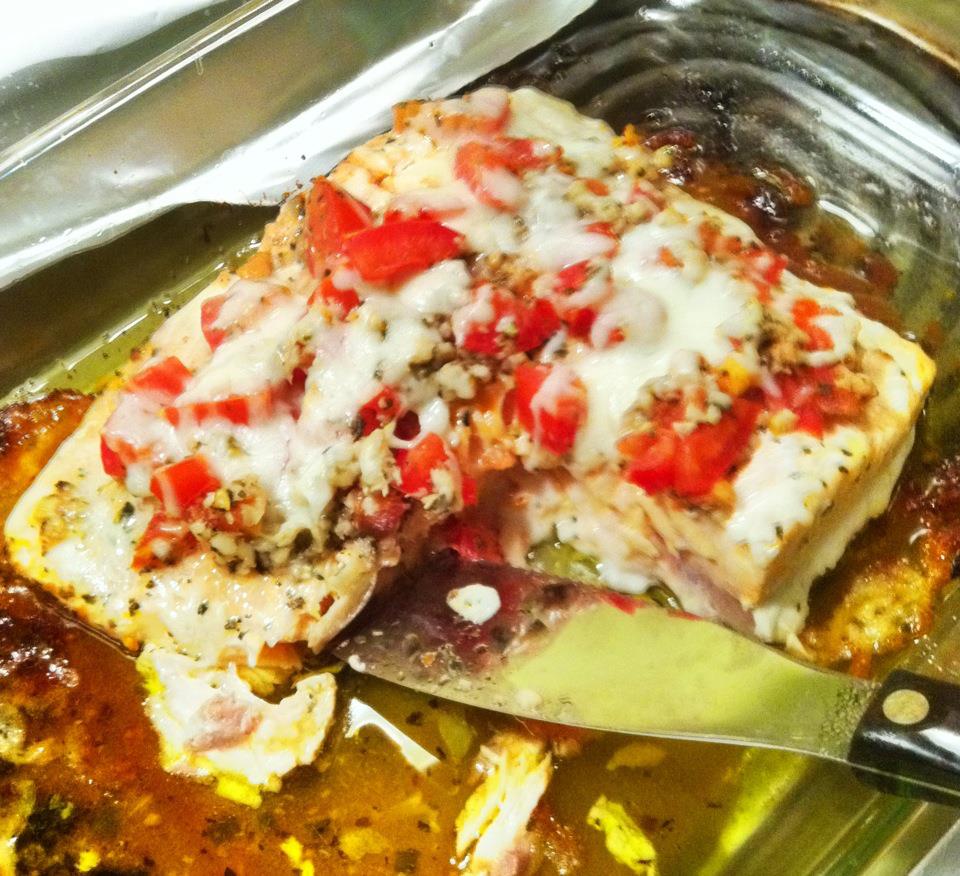 8. After 15 minutes remove salmon and put the tomato/garlic/basil mixture over it and sprinkle it with cheese