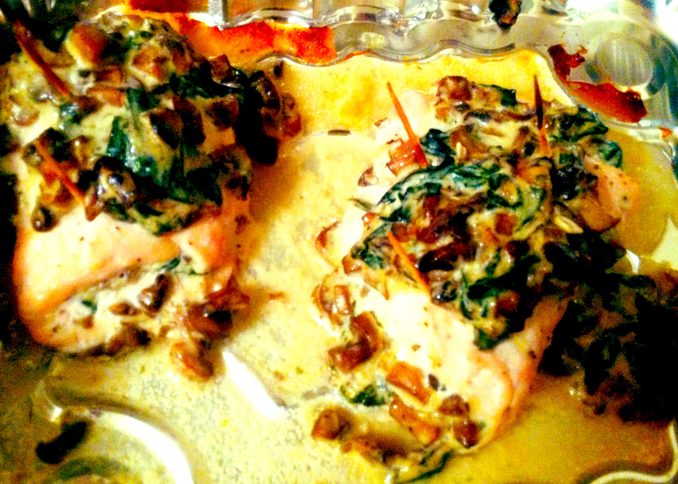 12. Once all the chicken breasts are filled, place any leftover mushroom/spinach mixture on top of the chicken breasts
