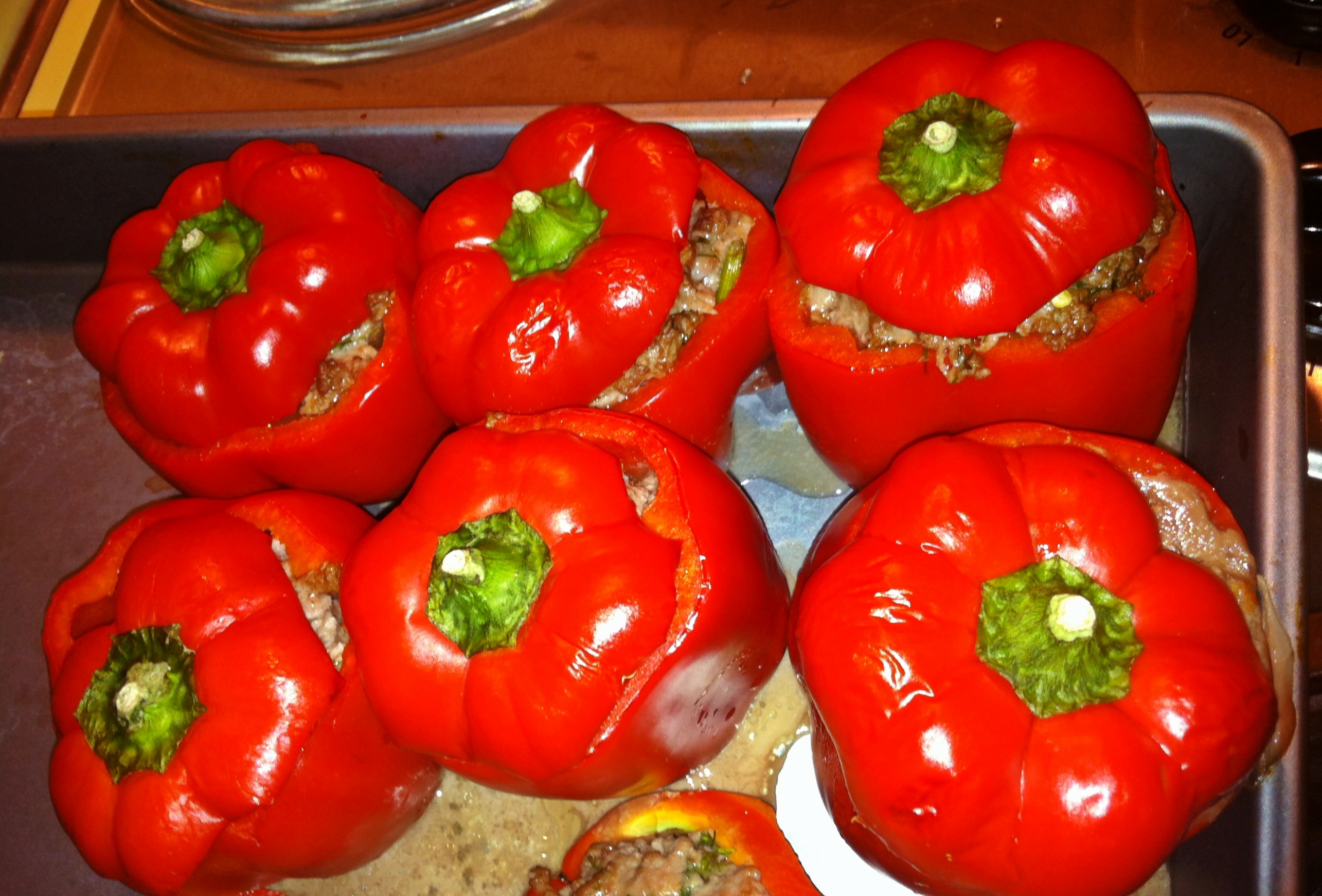 6. Pour tomato sauce into baking dish and lay peppers flat on top of tomato sauce