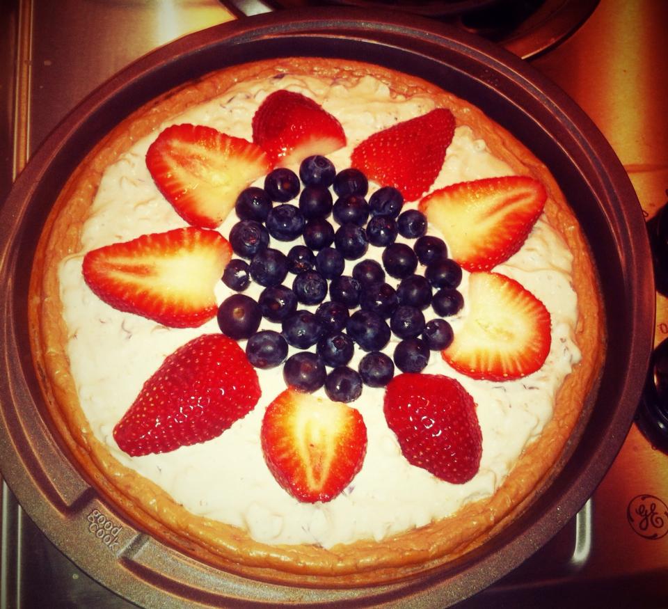6. Once the cheesecake has cooled (~5 hours), spread icing on top and decorate with strawberries and blueberries