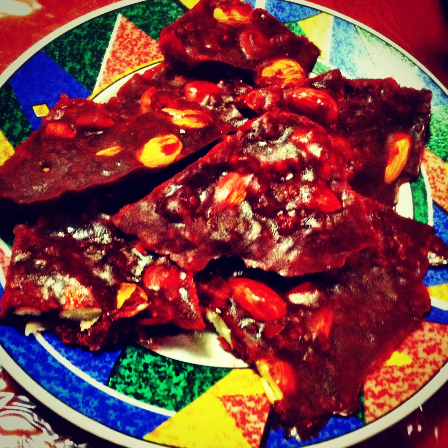 These come out tasting kind of like sherbet with chocolate. If you want them to be more chocolate than raspberry than melt some dark chocolate in a baking dish, mix it with 1 cup raspberries and 1/3-1/2 cup almonds and refrigerate for 1 hour