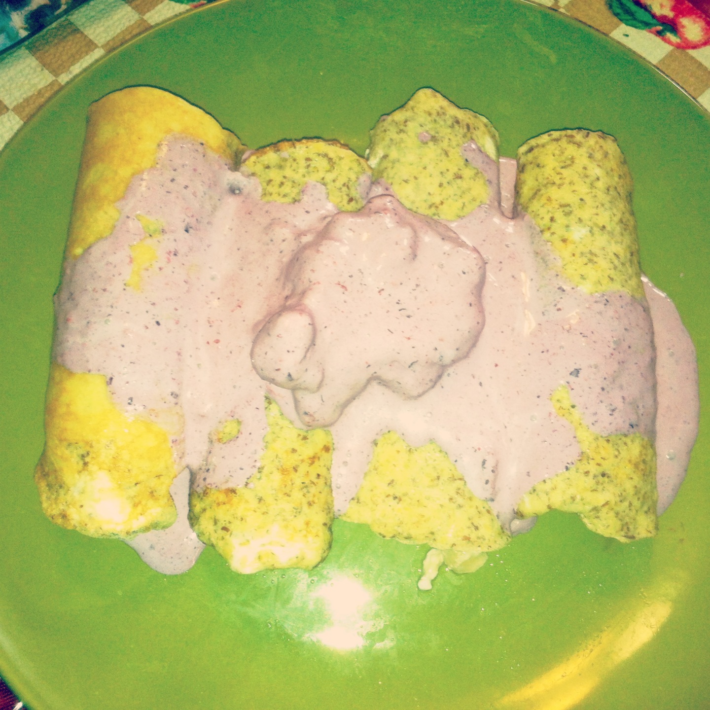 1 In a bowl combine and mix almond flour, flaxseed flour, 2 eggs, 1/5 cup coconut oil and half and half. This is your crepes batter. Consistency should be liquid